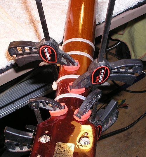 | I managed to use a syringe to slowly inject small amounts of glue into the crack being careful not to load it up next to the truss. Once I had good even and complete coverage on went the clamps and the excess cleaned off. |