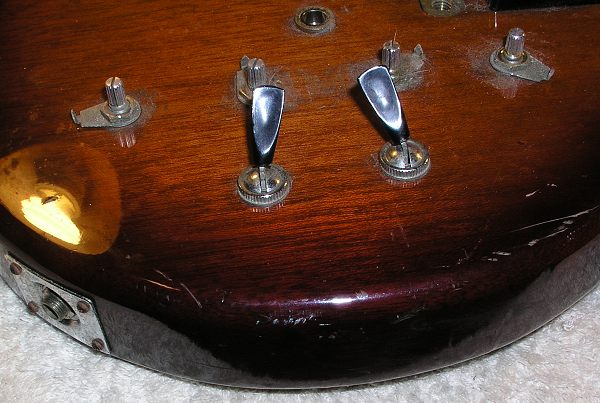 | The hardware cleaned up pretty well. There were still some finish imperfections, mostly from the fall in the booth. If you look closely at the headstock you'll see where I feebly attempted to mask off the logo, and how the original finish was milked up a bit for some reason. |
