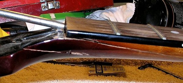 | The neck was split in multilple places. I wasn't sure if the truss was still intact but after checking, fortunately it was. Now, whether I could get the hide glue in there evenly enough to get a good bond without gluing the truss in place was the question. |