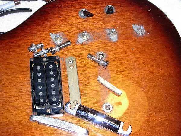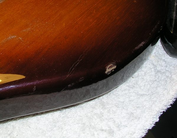 | The hardware cleaned up pretty well. There were still some finish imperfections, mostly from the fall in the booth. If you look closely at the headstock you'll see where I feebly attempted to mask off the logo, and how the original finish was milked up a bit for some reason. |