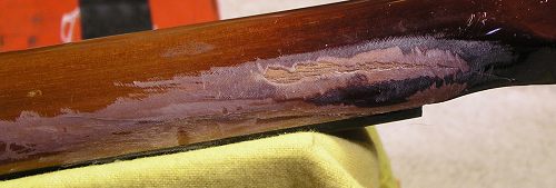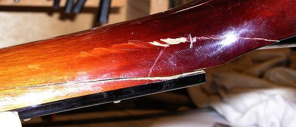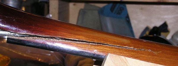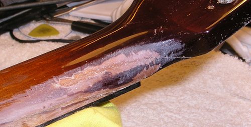 | The neck was split in multilple places. I wasn't sure if the truss was still intact but after checking, fortunately it was. Now, whether I could get the hide glue in there evenly enough to get a good bond without gluing the truss in place was the question. |