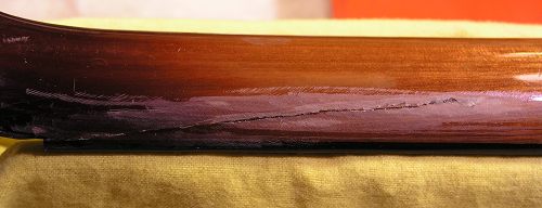 | A good 24 hours later the clamps came off and I had a good, tight, well compressed bond. Exactly what I was hoping for. Only hairlines were visible where the wood was split which means only enough glue to glue to form a lasting bond. Too much is brittle and could come undone. I have had that happen on a guitar someone else did and it left ugly bruises on my left hand where the headstock swung around and nailed me from the string tension. After roughing out the cracks I would be ready for fill and smooth. |